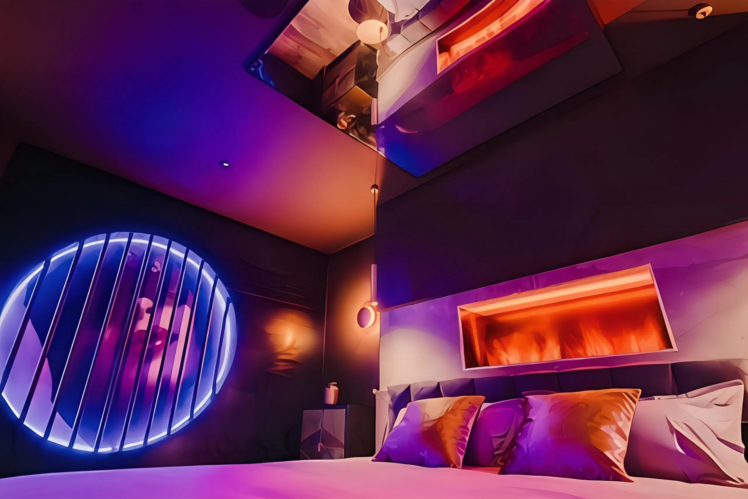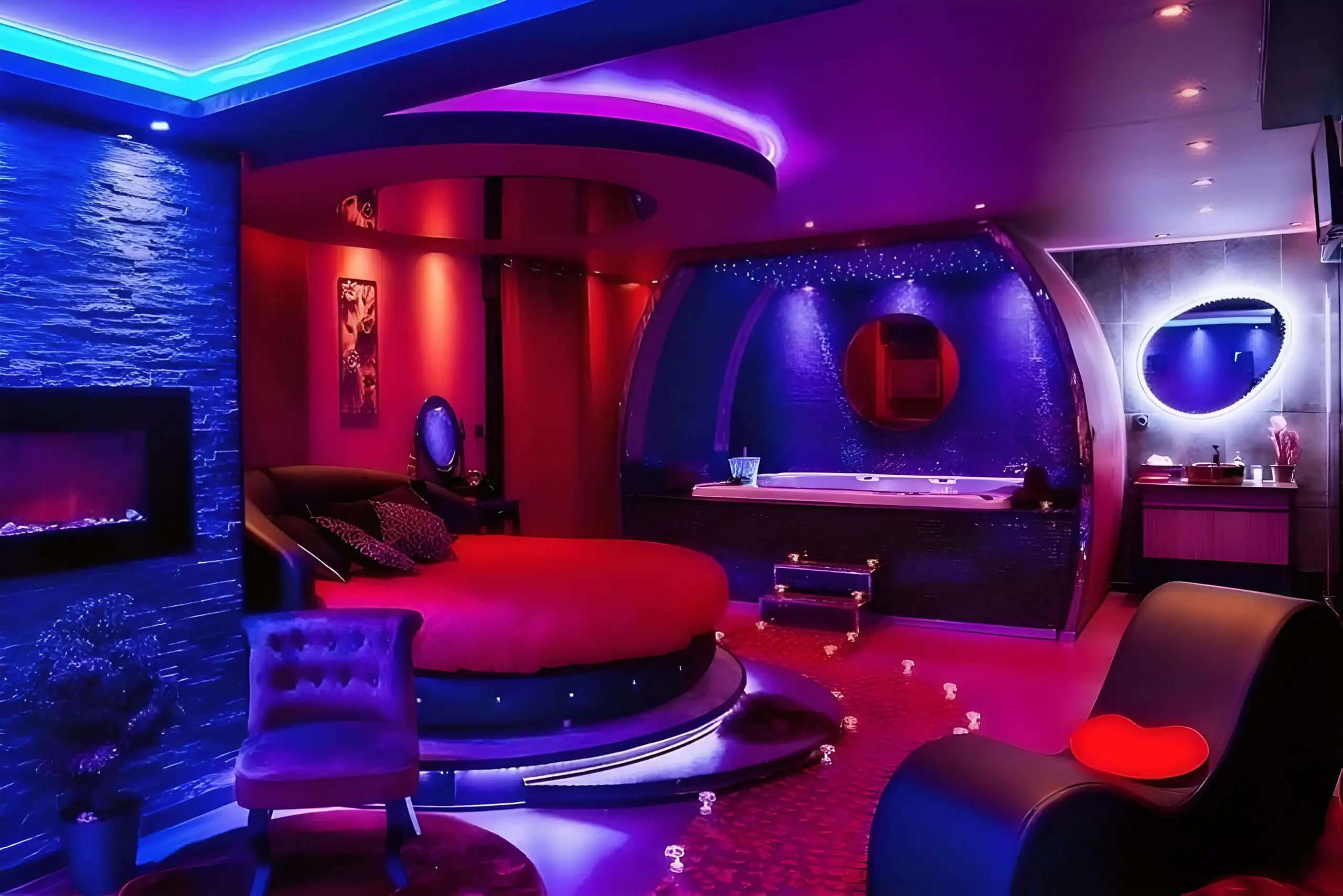 Découvrez la Suite Luxueuse de l’Insolite Spa Privatif, un espace cosy et romantique de 65 m² dans le quartier Nord de Toulouse. Profitez d’un grand jacuzzi avec ciel étoilé, lit rond 2 m avec miroir au plafond, douche à l’italienne, cuisine équipée, bar, deux télévisions et grand canapé. Créez votre ambiance grâce aux jeux de lumière et effets miroir, et détendez-vous sur la petite terrasse extérieure. Une escapade intime et glamour, idéale pour savourer confort et détente à deux.