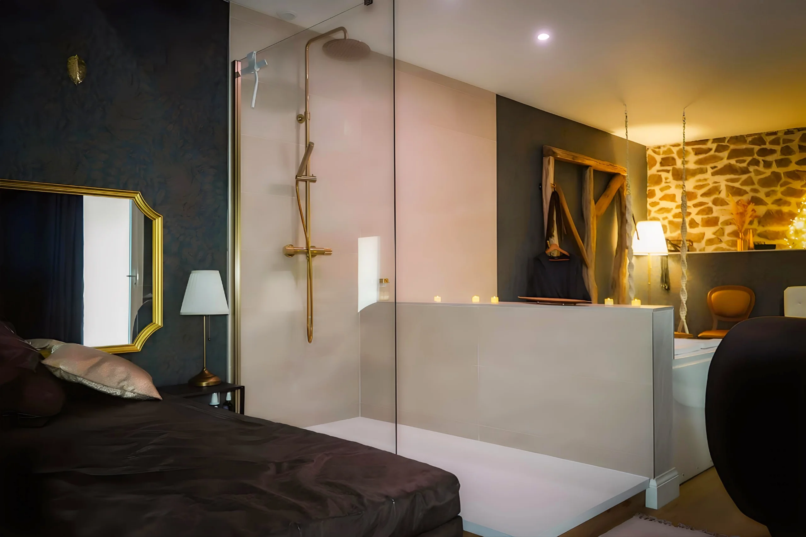 Entre Rennes et Laval, découvrez une suite élégante aux tons noirs et dorés, pensée pour profiter à deux d’un moment de détente. Spa de nage et douche sensorielle privatifs, table de massage, lit King Size avec miroir, cuisine équipée, musique et éclairages personnalisables. La suite dispose également d’un salon, d’un jardin et d’un espace extérieur privatif. Services inclus : petit-déjeuner, apéritif, linge de maison et privatisation totale. Une escapade raffinée pour savourer confort et intimité dans un cadre chic.